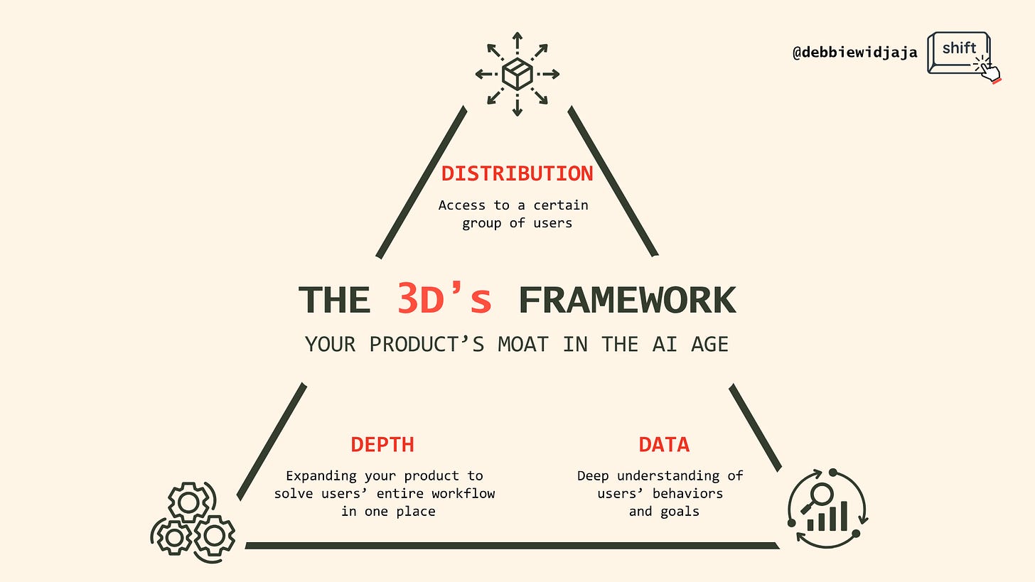Having worked with both startups and tech giants, I've seen this pattern play out before. The winners aren't always the ones with the best product — they're the ones who build moats that others can't easily copy. I call this the 3D's framework: Data, Distribution, and Depth.